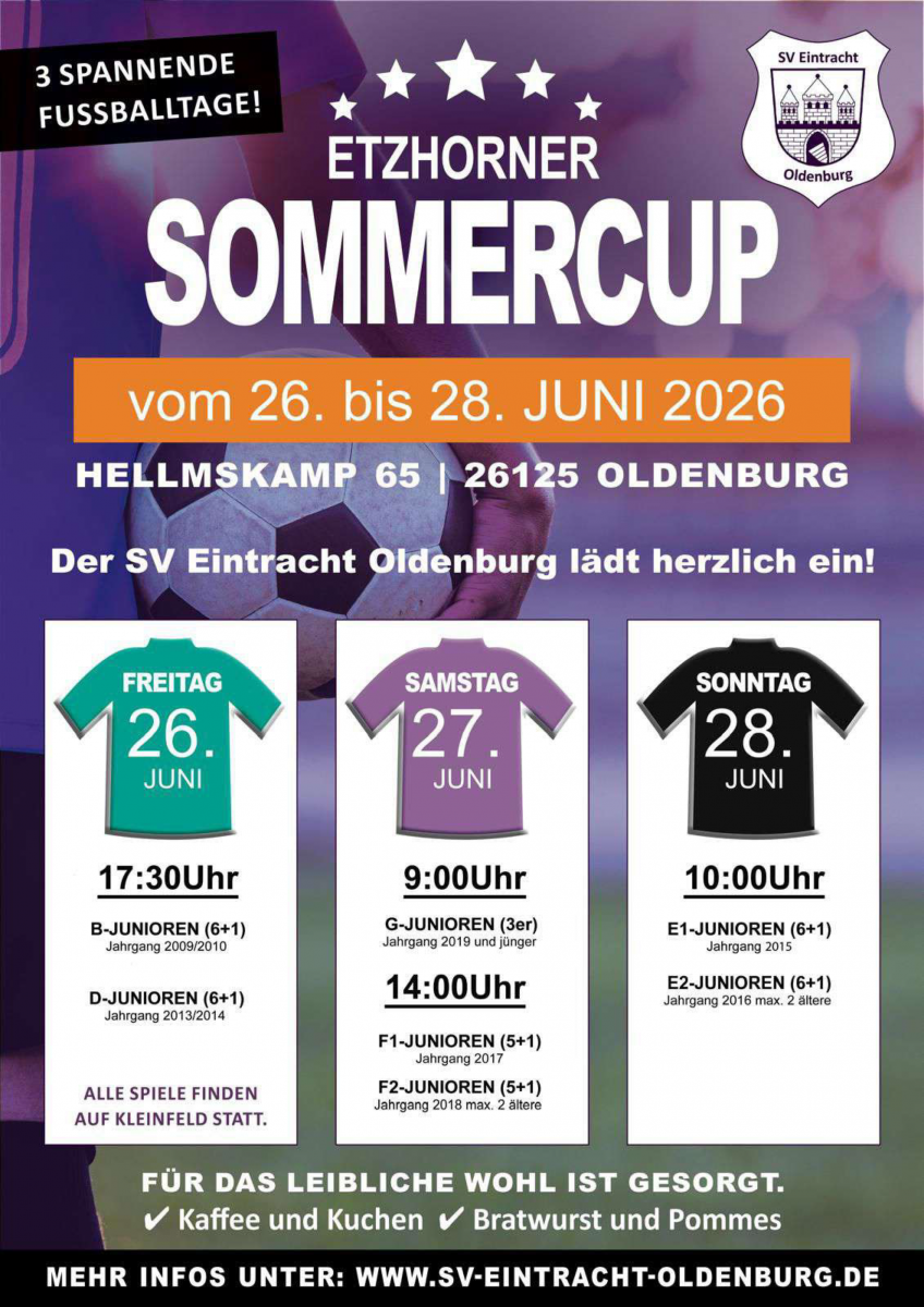 der SV Eintracht Oldenburg lädt Euch herzlich zum Etzhorner Sommercup 2026 ein! Vom 26. bis 28. Juni 2026 verwandelt sich unsere Sportanlage in Oldenburg-Etzhorn wieder in ein Zentrum des Jugendfußballs.
